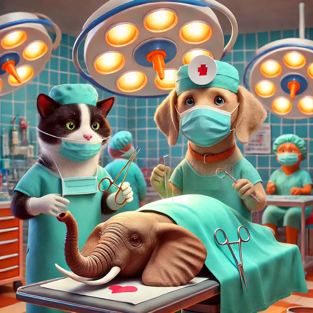 Prompt: 'Draw a picture of a dog and a cat dressed as surgeons and operating on an elephant'